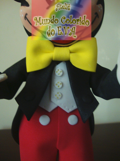 | Mickey: detalhes da gravata, colete, casaco e calça |